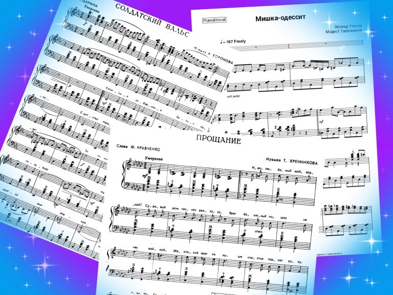 - «Mishka, the Odessite», «Two Maxims» («So-so-so says the machine gunner»), «Soldier's Waltz» («When We Return Home») created by the author Vladimir Ambrosimovich Dihovichniy (1911–1963);